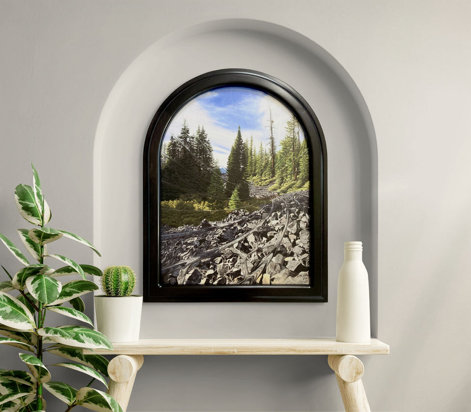 The painting is framed in a gold painted poplar wood frame. Also available in stained black with a smooth satin varnish finish.