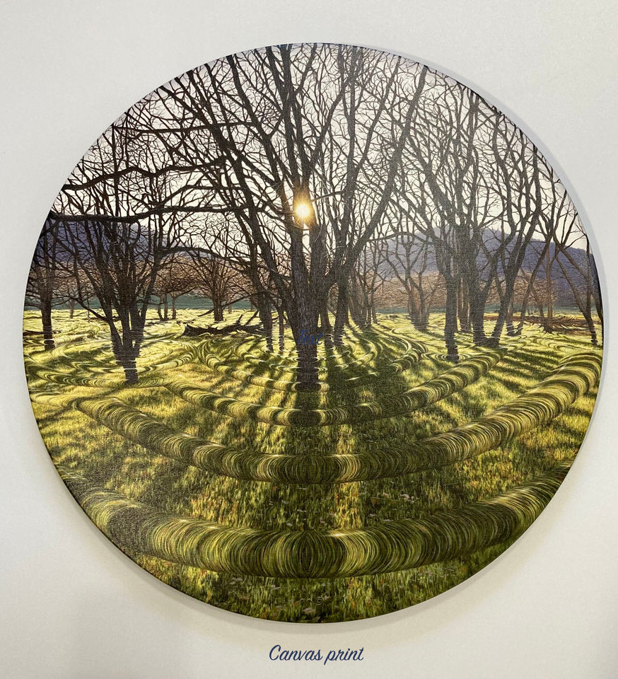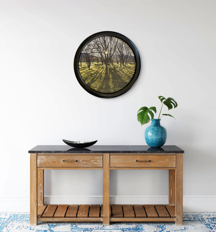 Signed and numbered limited-edition archival prints. Available in 2 sizes on fine-art paper, a round canvas wrap, or a mounted and framed canvas print.